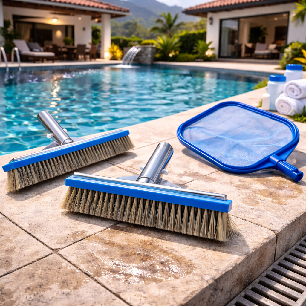 Las paredes de la piscina acumulan algas y depósitos de cal que el cloro no elimina solo. El cepillo de pared se usa para restregar las paredes y el piso antes de aspirar. Existen modelos para piscinas de fibra de vidrio y para piscinas de concreto — es importante usar el correcto para no dañar la superficie.